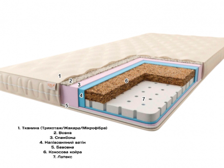 - Екологічно чисті матеріали: Матрац виготовлений з матеріалів природного походження, що не деформуються, не вбирають вологу та мають хорошу повітропроникність.