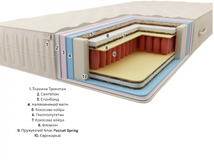 Наповнення: Тканина Трикотаж, Синтепон, Спанбонд, Напіввовняний ватин, Пінополіуретан, Кокосова койра, Флізелін, Пружинний блок Pocket Spring, Єврокаркас.