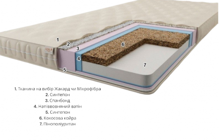 Склад: тканина жаккард, синтепон, спанбонд, напіввовняний ватин, синтепон, кокосова койра, пінополіуретан. (Україна).